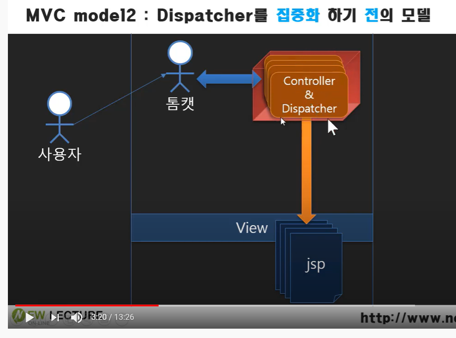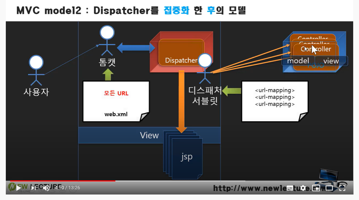 모델2은 컨트롤러와 뷰가 물리적으로 분리된 방식을 의미한다. 그리고 DisPatcher를 집중화한 후의 모델이다.