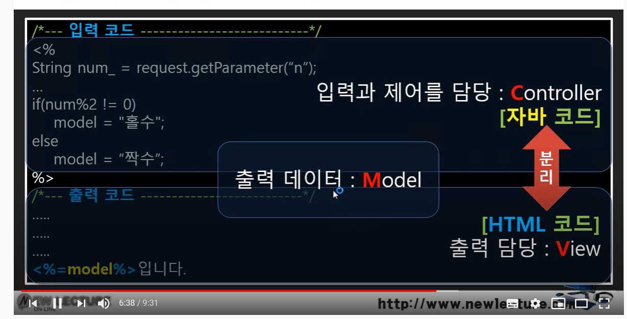 즉, 모델2 방식은 자바 코드와 JSP 코드가 분리되어 있다.