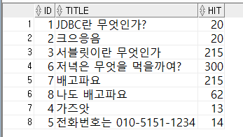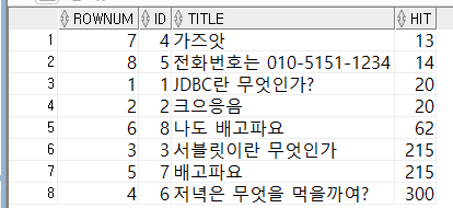 즉, SELECT문에 의해 이미 ROWNUM이 1 ~ 8까지 순서대로 뽑아진 상태에서 ORDER BY 절에 의해 HIT 순으로 재정렬이 되었기 때문에 ROWNUM의 순서가 꼬일 수 밖에 없다! (ROWNUM은 SELECT 절에서 사용되기 때문에)