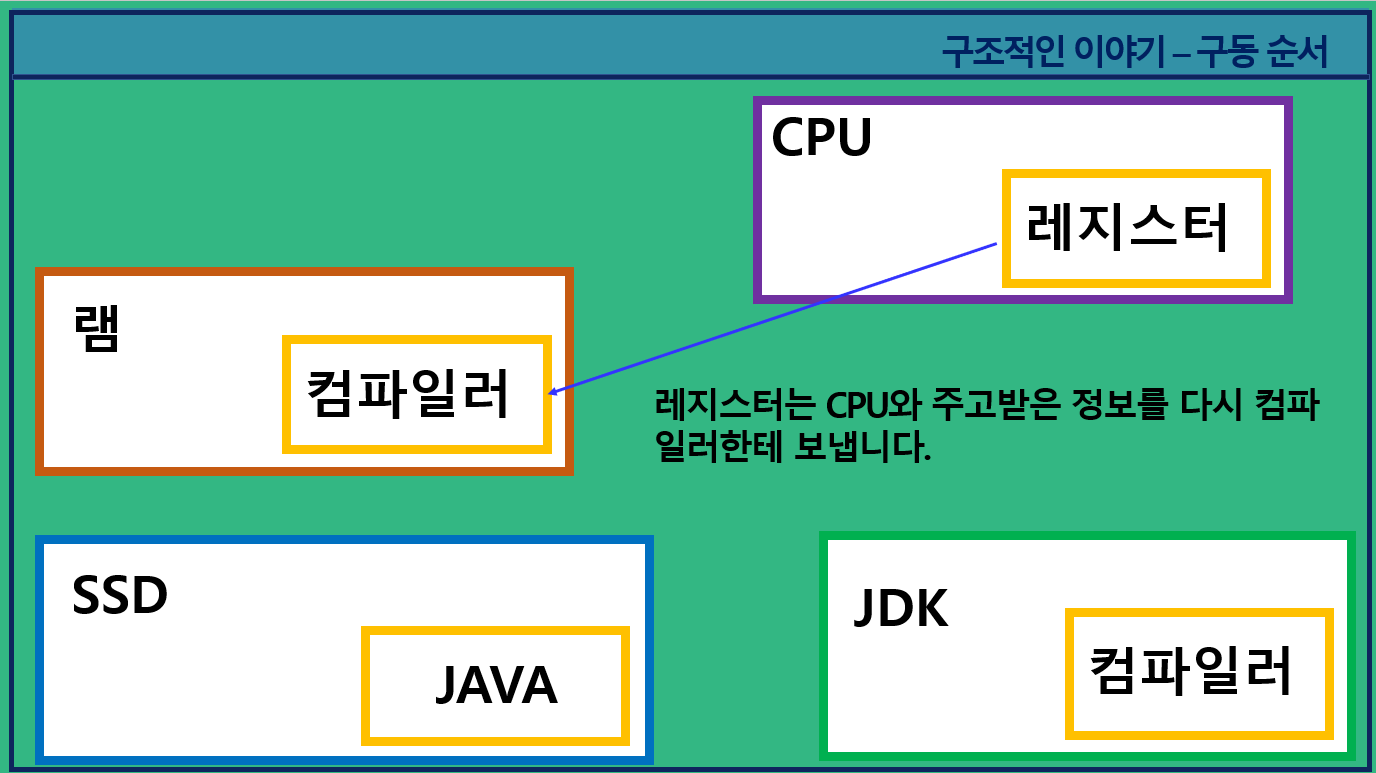 5. 레지스터는 컴파일러에게 받은 자바 정보를 CPU와 주고 받습니다.
