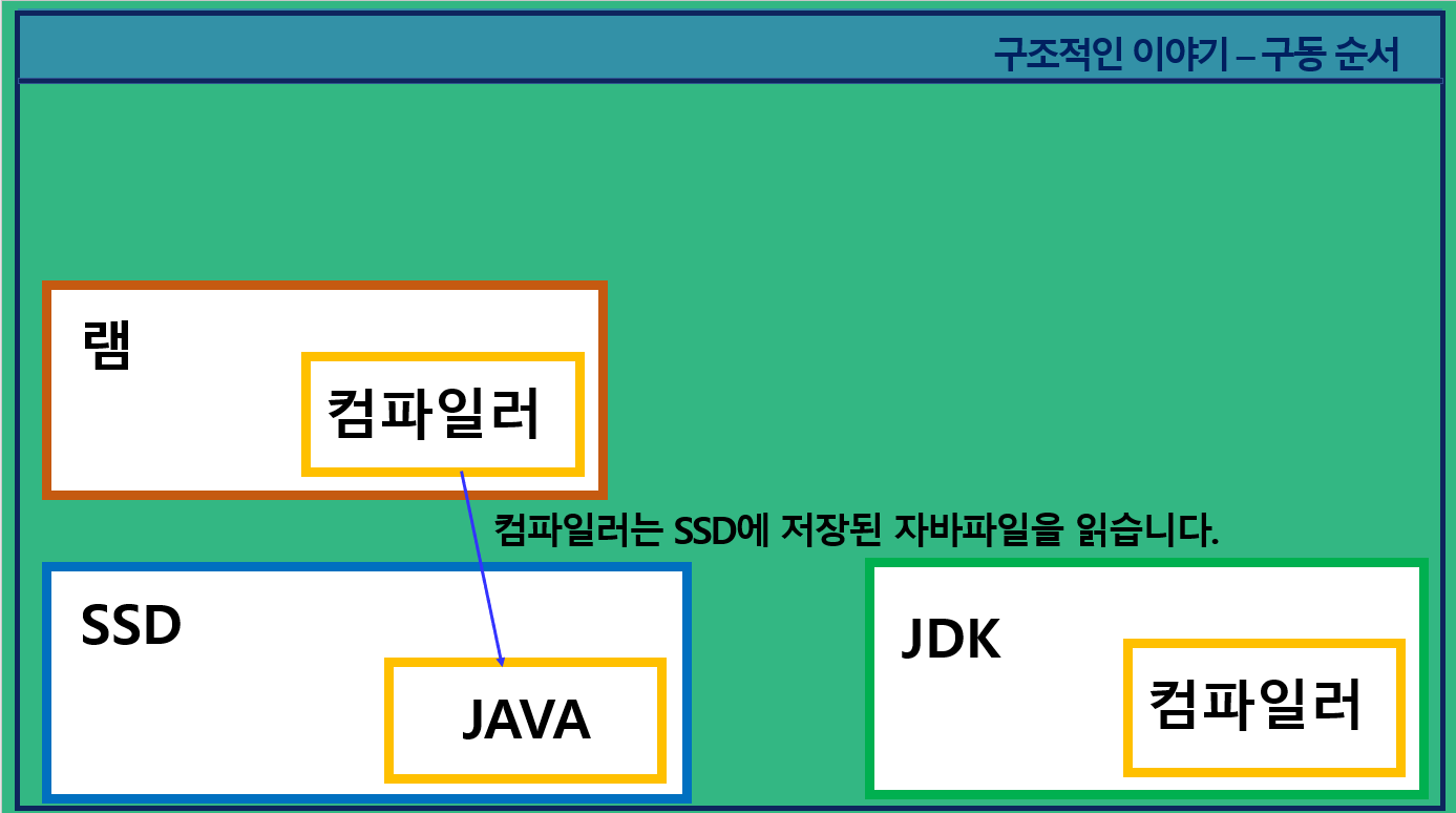 3. 램에 위치해 있는 컴파일러는 SSD에 저장된 자바 파일을 읽습니다.