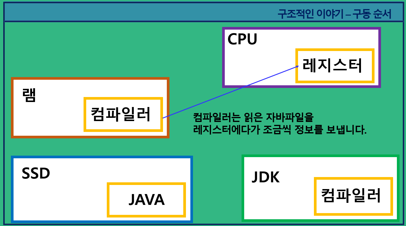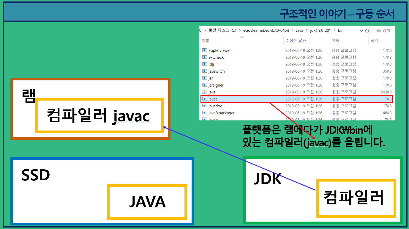 jdk\bin에 위치한 javac 컴파일러가 자바 코드(.java 파일)를 JVM(자바가상머신)이 이해할 수 있는 형태인 바이트 코드(.class 파일)로 변환합니다.