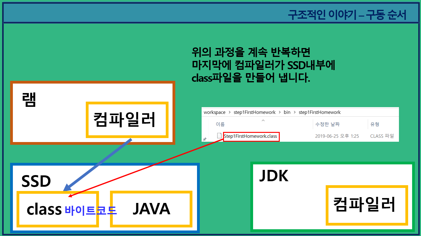7. 4번부터 6번까지의 과정을 반복하다가 레지스터가 모든 자바파일의 정보를 CPU와 주고받는 작업이 끝나면 컴파일러가 SSD 내부에 .class파일(바이트 코드)를 생성합니다.