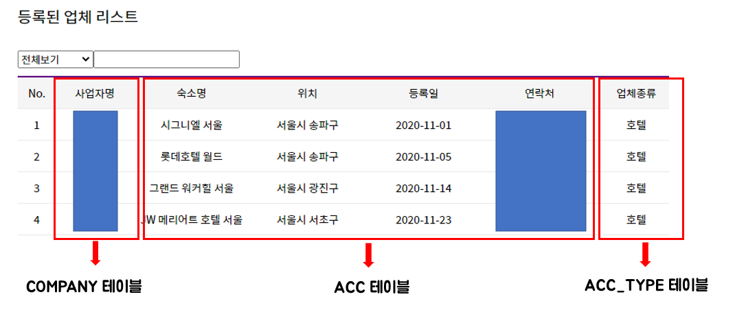 3. 숙소명, 위치, 등록일, 연락처는 'ACC' 테이블이 관리를 하고 있습니다.