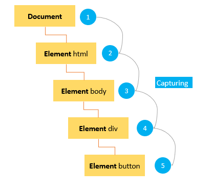 이벤트 버블링이 어떤 요소에 대해 이벤트가 발생했을 때 해당 요소의 최상위 부모까지 이벤트가 전달되어지는 과정을 의미한다면, 이벤트 캡쳐링은 어떤 요소에 대해 이벤트가 발생했을 때 최상위 부모로부터 이벤트가 발생된 요소까지 이벤트가 전달되어지는 과정을 의미합니다.