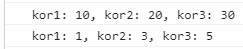 console.log(`kor1: ${kor1}, kor2: ${kor2}, kor3: ${kor3}`);