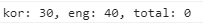 console.log(`kor: ${korea}, eng: ${english}, total: ${total}`);