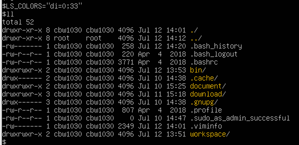 LS_COLORS="di=0;33" -> 디렉토리 33번 색(오렌지)으로 변경한다