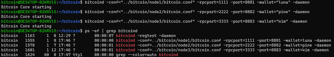 각각의 conf 파일을 생성했으니 3개의 regtest 네트워크를 백그라운드로 실행해보자.