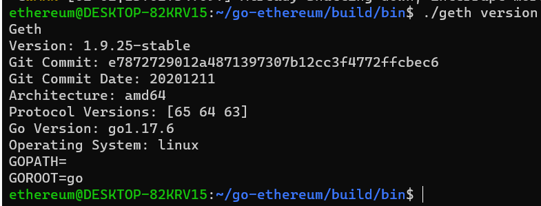 해당 명령어가 끝나면 build/bin 경로에 접근하여 ./geth version 명령어를 통해 현재 설치된 geth version이 확인되면 끝입니다.