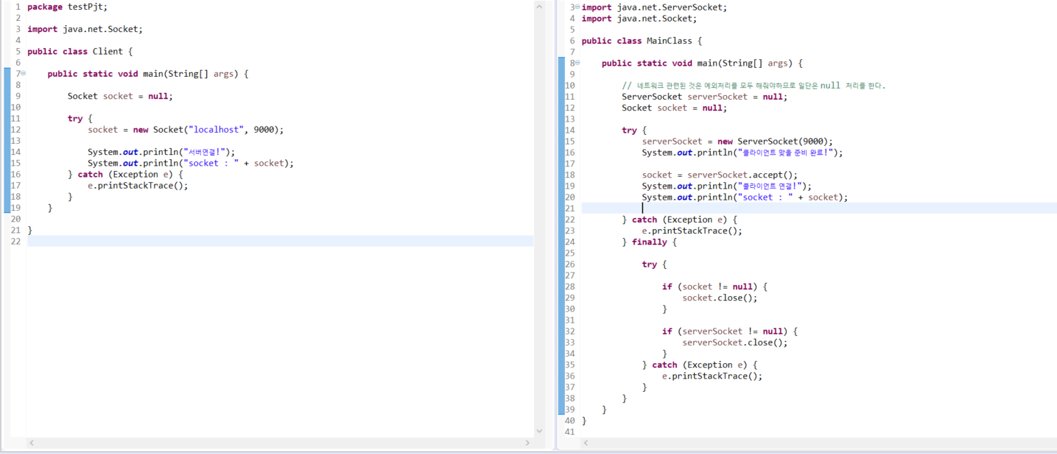 클라이언트 측 소스코드도 마찬가지로 예외처리 구문 밖에다가 인스턴스 변수인 socket만 선언해주고 null을 할당해주자.