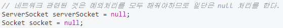 네트워크와 관련된 부분은 모두 예외처리를 하지 않으면 에러가 나기 때문에 null 처리를 한 후, try 구문 내부에 객체를 생성한다.