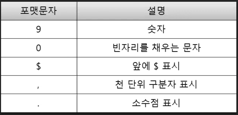 - NUMBER 형식을 문자열(VARCHAR2)로 변환하는 함수이다.