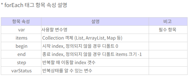 반복문과 관련된 태그로, forEach 태그는 자바 for문과 유사하다. 가장 유용하고 중요한 JSTL 태그 중 하나이다.