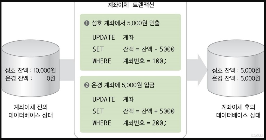 만약 성호의 UPDATE문이 정상적으로 실행됐으나 은경이의 UPDATE문이 실행되지 않는다면, 성호가 5000원을 이체했으나 은경이가 이를 받지 못해 5000원이 사라지는 모순된 상황이 발생할 것이다.